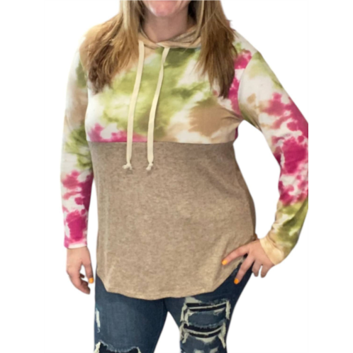 Whether you're running around town or lounging at home, this sweatshirt works for both.Cowl neckline. Long sleeves. Attached hood with drawstring. Tie dye. Pullover style. True to Size. 96% Polyester 4% Spandex. Machine wash cold.