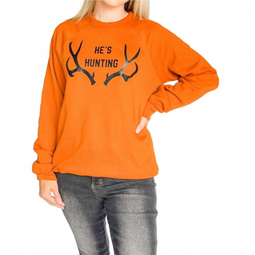 Whether you're running around town or lounging at home, this sweatshirt works for both.Elevate your fall wardrobe with the He's Hunting Crewneck Sweatshirt by Section 21 Apparel, crafted to keep you cozy and stylish. Featuring long raglan sleeves and a graphic design in vibrant orange, this sweatshirt is a seasonal favorite for women embracing Western trends. Made from a premium blend of Airlume combed cotton and polyester fleece, it showcases unbeatable softness and warmth. Designed with a classic crewneck, it is perfect for layering or as a standalone piece for vacation vibes.