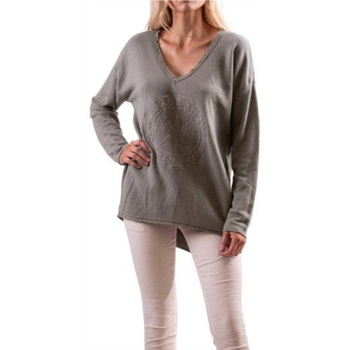 You'll be reaching for this comfy and classic v-neck sweater all season long.Meet the Nordernen V-neck Sweater by GIGI MODA, a chic piece for the modern woman's fall wardrobe. This olive sweater features long sleeves and is designed with an embossed front logo and a high-low hem for a stylish twist. Crafted from a comfortable blend of 75% cotton and 25% polyester, it’s pull-on closure makes it a breeze to wear. Made in Italy, it comes in one size and is machine washable just lay it flat to dry for best results.