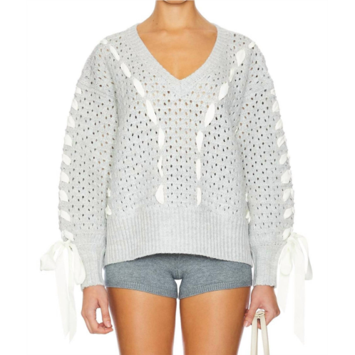 Wear this v-neck sweater with your favorite denim for the perfect fall look.Introducing the Liberty V Neck Sweater by For Love & Lemons, a perfect blend of elegance and comfort. With its long sleeves and composition of 77% acrylic, 9% nylon, 8% wool, and 6% PBT, this sweater is complemented by 100% polyester accents for added style. The pull-on closure enhances its easy-wear appeal, while the semi-sheer fabric with ribbon details offers a chic, layered look. Care for this sophisticated sweater by opting for dry cleaning to maintain its quality.