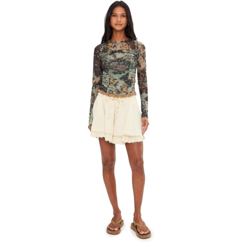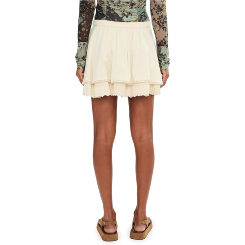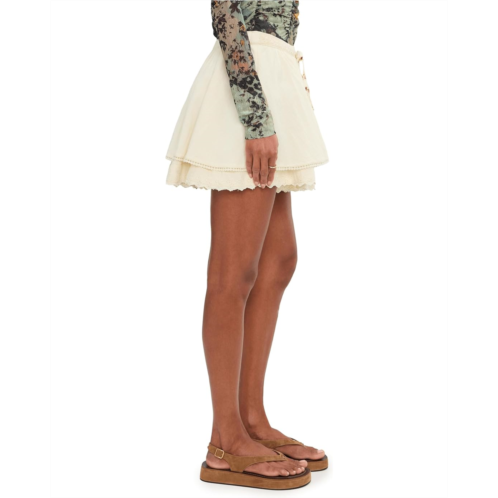 - Bold and confident, the Free People Lady Tulip Mini Skirt hugs just right while keeping things comfortable. Made for nights out, statement looks, and fearless fashion choices, this skirt features a layered bohemian design with delicate eyelet embroidery at the hem, a crochet-lace waistband, and a dainty blue-patterned drawstring tie.