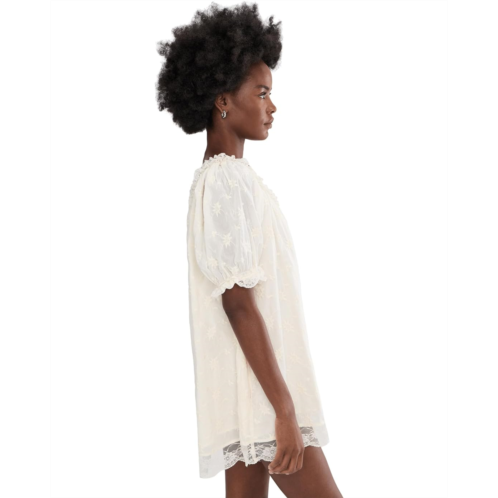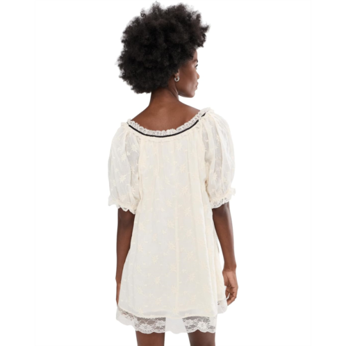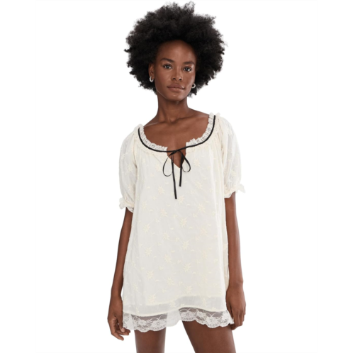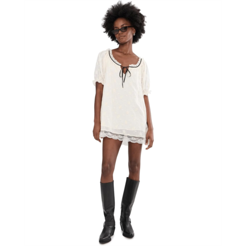 - Endlessly charming and forever femme, the Free People Juno Mini Dress features a light, breezy cotton fabrication, stunning embroidered details, and a swingy, baby doll-inspired silhouette for a vintage feel. This short and chic dress features scoop neckline, short puff sleeves, ruffle accents, and scallop hem.