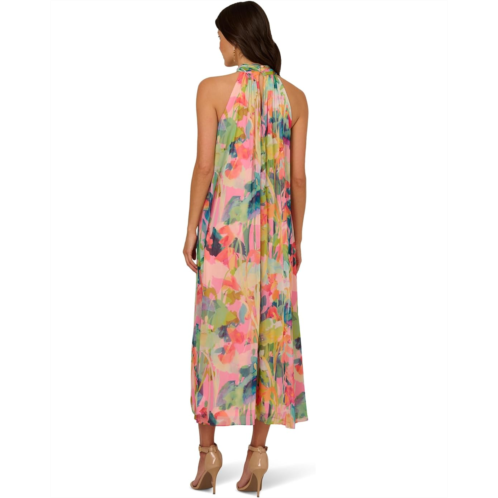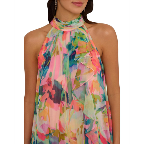 - The Adrianna Papell Print Chiffon Trapeze Dress brings effortless movement and artistry together. Crafted from airy watercolor print chiffon, it features a high neckline with delicate gathers that flow into a breezy trapeze silhouette. A cascading ruffle drapes down the bodice, enhancing its soft, ethereal feel. The narrow halterkorea shoulders add a refined touch, while the back keyhole button closure ensures a polished finish. It is styled with an allover floral print and a zippered back closure. From vacation and destination weddings to formal events, this dreamy midi dress calls for grace and ease, and you'll find yourself reaching for this colorful halter dress again and again.