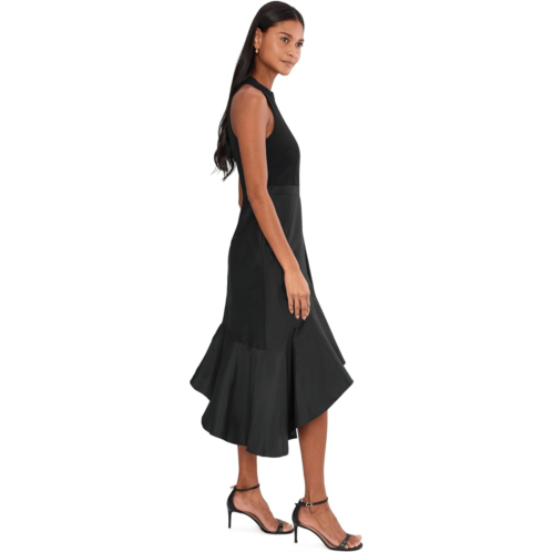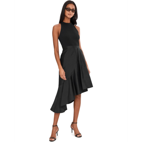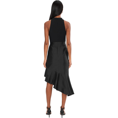 - This Adrianna Papell Crepe Combo Taffeta Dress features a halter top in matte crepe and an asymmetrical skirt in lustrous and crisp taffeta fabric. The knit bodice fabric and a zippered back closure create a fitted look through the hips with the straight-fit skirt flaring into a draped asymmetrical ruffle hem. It is cut in a blouson silhouette for a flattering look. Wear this sleeveless midi dress when you want a sleek and sophisticated monochrome look.