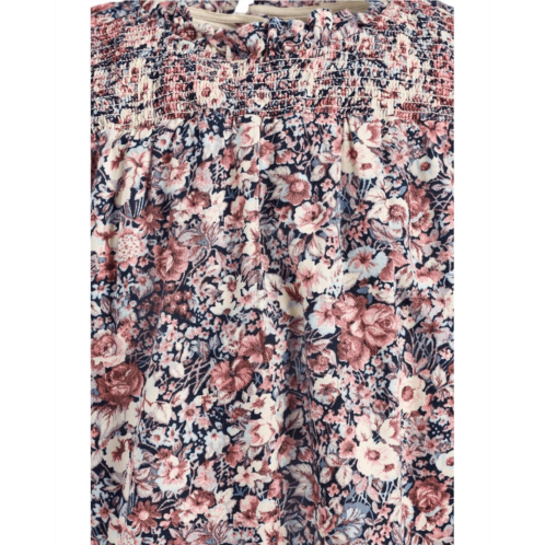 Stun everyone with your style game wearing the Janie and Jack Ruffle Front Floral Dress. The pull-on style dress features a mock neck with smocked details, long sleeves with smocked cuffs, a back-button closure, an allover floral print, and a ruffled hem.