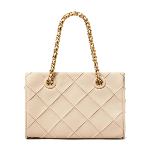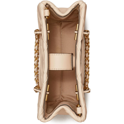 Beguiling and enchanting, Tory Burch Fleming Soft Mini Chain Tote crafted from polyester lining. This quilted handbag features two top handles, magnetic snap closure, and removable leather crossbody strap.