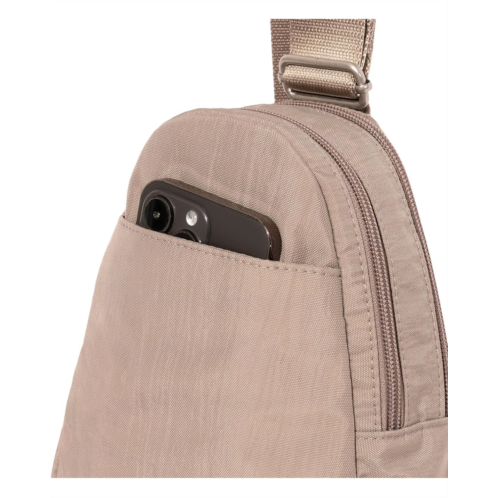 Designed with an adjustable strap that extends from 26' to 54', the Baggallini Double Zip Mini Sling offers versatile styling. This stylish sling bag can be worn on the left or right side. Easy to carry around, this belt bag comes with a lipstick loop and key leash for added storage and functionality. Get ready for the office or a vacation trip with this chic sling bag.