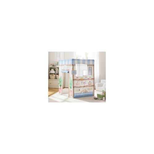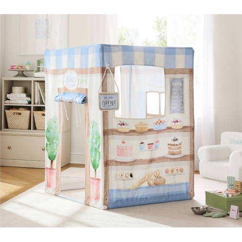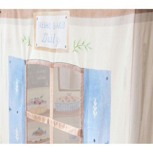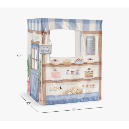 Our pop-up bakery will be their sweet spot for hours of make-believe fun. The durable cotton canopy is decorated with cakes, cookies, cupcakes and breads, an open window and a roll-up door. Just drape it over the sturdy frame and hang up the included “open” sign, and they’re in business.