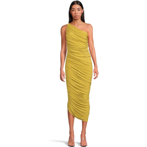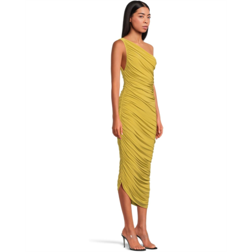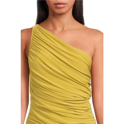 Single-shoulder gown flaunts ruching throughout the side seams for an allover gathered effect.