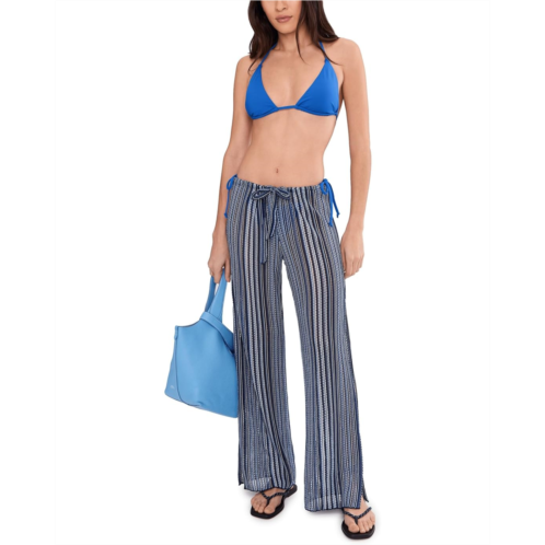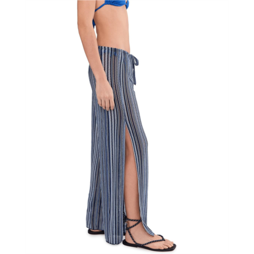 The BECCA Seaside Crochet Knit Split Leg Pants have an adjustable drawstring waistband in a multi-color stripe pattern, taking you from beach to street. Made from jacquard crochet knit, they are designed with side slits and ties at the hem to create a harem look.
