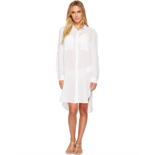 Lightweight shirt dress features crinkle cotton fabrication that is semi-sheer for a beach ready look.