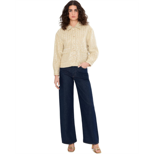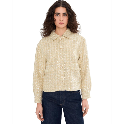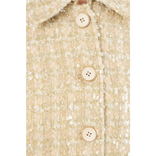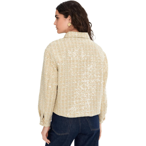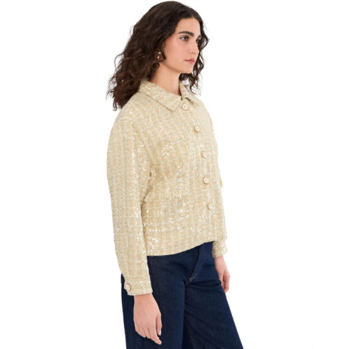 The Vince Camuto Long Sleeve Button-Down Tweed Jacket is designed with shimmering fabric and sequins that create a radiant effect. It features a structured silhouette with a button-down front closure, long sleeves, and collared neckline that elevates any look.