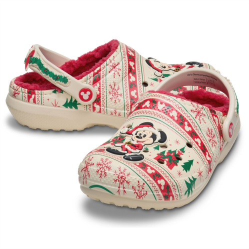 Slip into the holiday spirit in style wearing these Santa Mickey Mouse clogs by Crocs. They have a festive allover fair isle print featuring matching Santa Mickey charms on top and a Mickey Mouse icon and holly appliques along the heel strap. The super soft faux fur lining ensures each step is filled with comfort.
