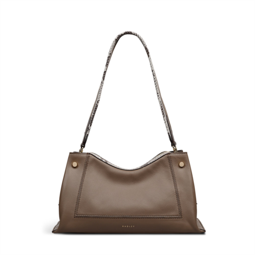 Our Designers experiment with creative construction to form the triangular silhouette of the Hope Gardens bag. Folded edges, pinched bases at the sides and inlaid panelling are just a few of the specially shaped features you’ll see. Finished with an extended zip, contrasting snake-embossed trims and a split handle construction.
