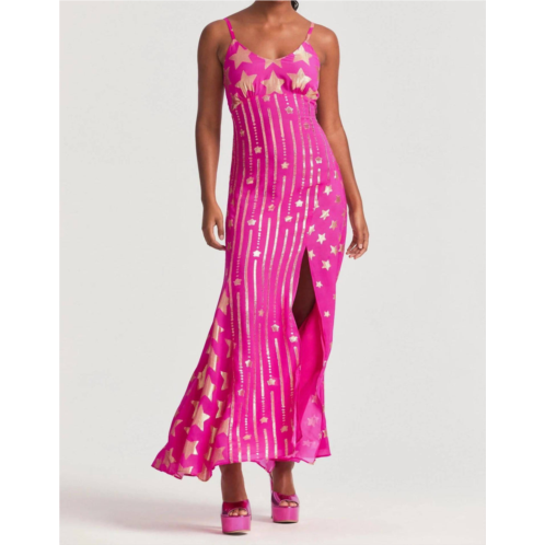 A maxi dress that is just as cute as it is comfortable.86% Viscose, 14% Metallic. Features a metallic gold star detailing with vertical falling stars contrasting along the skirt. This easy piece is ready to dance in a soft viscose fabric with a gorgeous strap detail at the back that allows you to tie the dress whichever way you’d like and a slit at wearers left. The back waist features elastic to fit your body perfectly and comfortably. Hand Wash. Shoulder to hem measures approx 60' in length. Model is wearing a size 2 [Height - 5'10', Bust - 31.5', Waist - 25', Hips - 35.5']