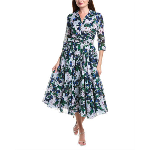 Introducing the Samantha Sung Aster Midi Dress, a stunning piece from the renowned brand known for bold prints and unique silhouettes for the modern woman. This dress comes in a soft blue color with a spread collar, belted waist, and dual side seam pockets for added convenience. With a length of approximately 48 inches from shoulder to hem, this dress is perfect for both casual outings and special occasions. The center back zipper closure provides easy wear, and the dress is made from 100% cotton. For best care, dry clean only. Imported. Model is 5'9 and is wearing a size 2. Please note that measurements may vary slightly by size.