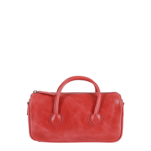 Rectangular leather bag by Margesherwood in a vibrant red hue. Smooth texture enhances its appeal. Double rounded handles and a detachable shoulder strap provide versatile styling options. A secure top zipper closure safeguards a single internal compartment for essentials.