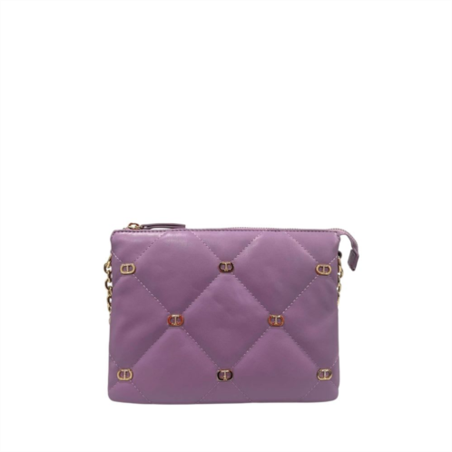 Exude confidence with Twinset’s shoulder bag, a perfect amalgamation of functionality and fashion-forward style. Boasting a striking purple hue, this chic accessory features a sleek chain shoulder strap and lustrous gold metallic accents that elevate your ensemble. Ingeniously designed with zip closure and internal compartments, it ensures your essentials stay organized in the most elegant way. Subtly embossed with Twinset’s iconic front logo, this stunner is a treasure for those who dare to stand out in the crowd.