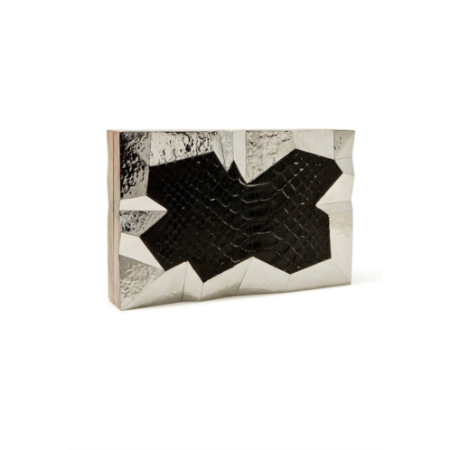 Don't be mistaken by its size, this little bag holds more than you'd expect!The Women's Abrolhos Clutch Bag by Emm Kuo is a striking accessory featuring a blend of materials like black python, hammered stainless steel, and mother of pearl siding. The design offers multidimensional allure with its lustrous silver and black color scheme. The clutch includes a detachable strap for versatile styling, coming in a compact size of 200mm x 110mm x 42mm. This piece lacks specific country of origin details.