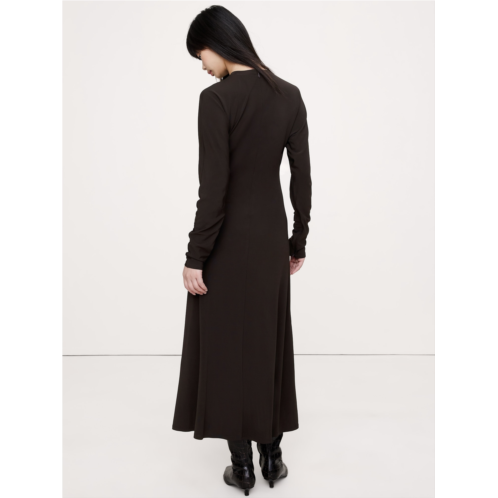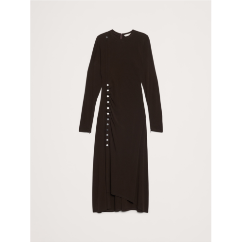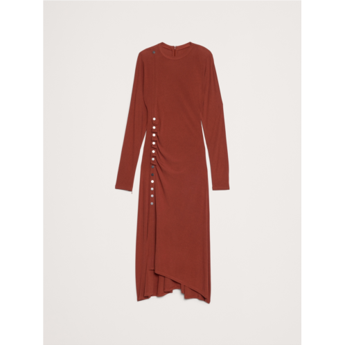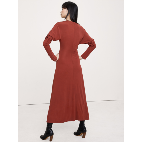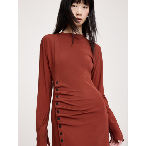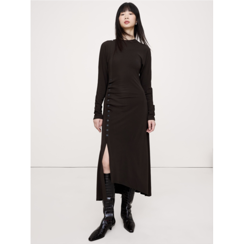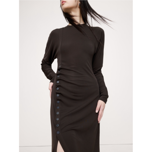 - Expert tailoring meets exceptional softness, we opted for a dramatic dolman-sleeve silhouette with a defined waist, adding a row of snaps so you can ruche at the waist and adjust the height of the slit at the hem. Crafted from a favorite jersey knit fabric that drapes beautifully across the body.