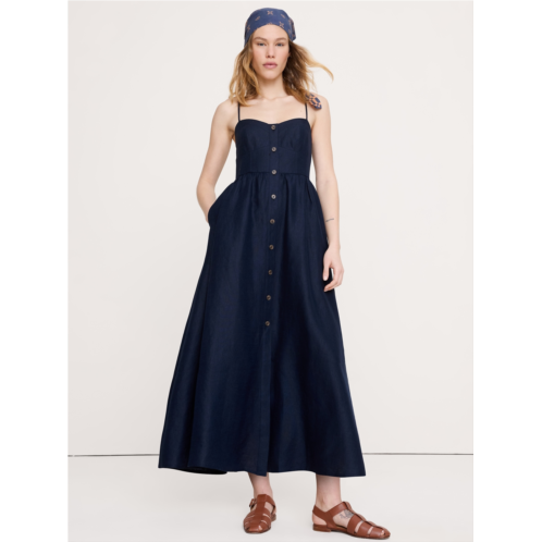 - Made from classic 100% certified-European linen, just the way we like it. We kept the silhouette of this long midi dress fitted through the bust and waist, with a floaty A-line skirt.