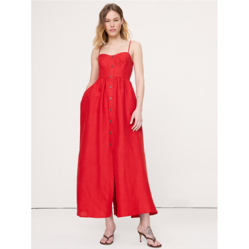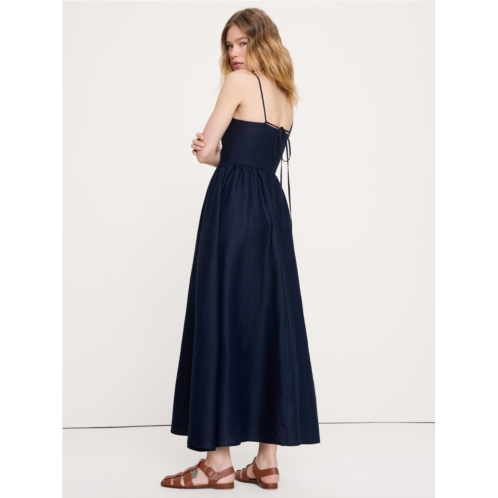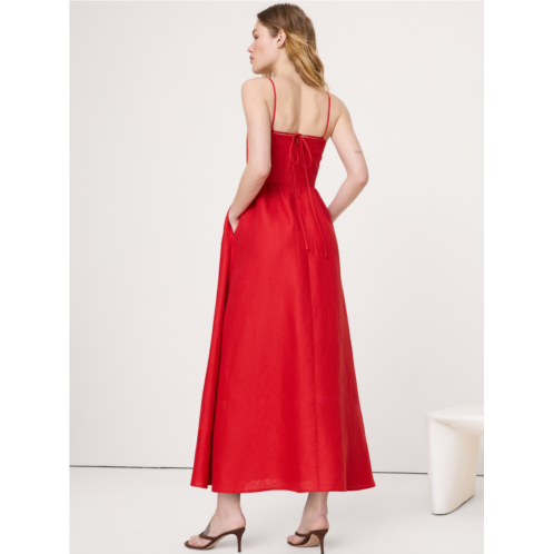 - Made from classic 100% certified-European linen, just the way we like it. We kept the silhouette of this long midi dress fitted through the bust and waist, with a floaty A-line skirt.