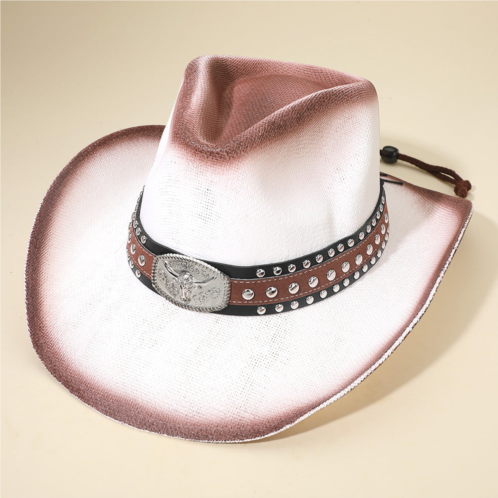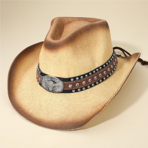 [US] FASHNZFAB western oval steer head buckle studded band cowboy fedora hat