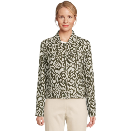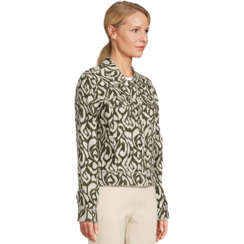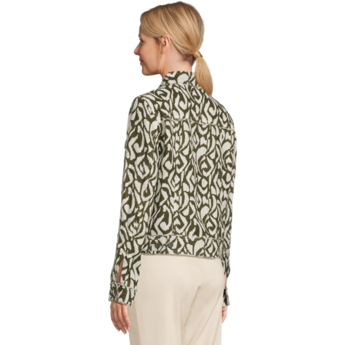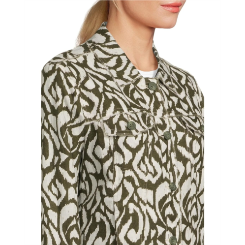 The Tommy Bahama Inlet Ikat Linen Jacket is a printed linen jacket featuring a bold ikat allover geometric print, traditional button-front closure, two side pockets, and double button-through chest pockets. In a traditional denim jacket silhouette, this printed jacket is cut from linen fabric that offers a perfect drape. Its contrast stitch details add to its style. This button-down jacket is styled with long sleeves, a high neckline, and a straight hem.