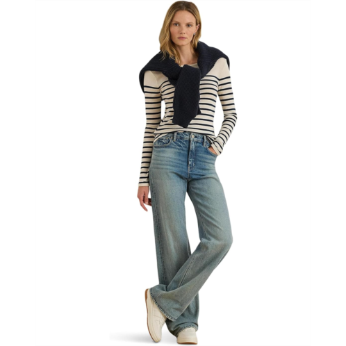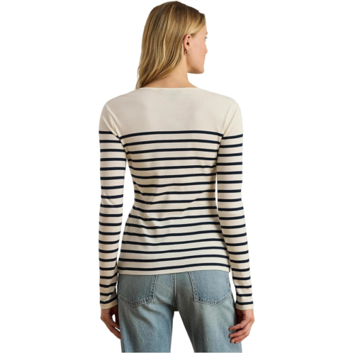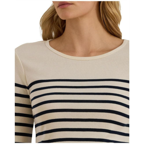 Add a bit of glamour to your casual styling wearing the LAUREN Ralph Lauren Striped Cotton Long-Sleeve Tee that comes in a slim-fitting silhouette with stretch-infused cotton for a soft touch feel. The top features a crewneck, long sleeves, 'LRL'-embroidered logo at the right hem, and allover striped print. It is intended to hit at the hip.
