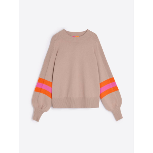 The ultimate go-to sweater, expertly crafted to provide the perfect combination of warmth and style. Its classic design and soft fabric make it a must-have addition to your wardrobe.Elevate your wardrobe with the Women's Balloon Sleeve Stripe Sweater by Vilagallo, featuring long sleeves and a stylish crewneck. This tan sweater is adorned with bold orange and pink stripes around the cuffs, providing a vibrant contrast and striking edge. Its pull-on closure ensures easy wear, pairing standout style with comfort effortlessly. Perfect for fall occasions and adding a pop to your Thanksgiving ensemble.