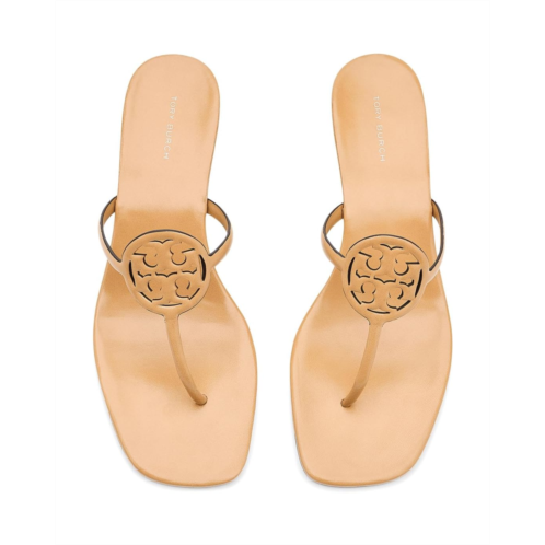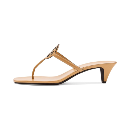 - Sleek and sophisticated, the Tory Burch 50mm Miller Capri Kitten Heel is designed to elevate your everyday look. Featuring the iconic T-monogram, this thong sandal is styled with slim straps for a minimalist, elegant feel.