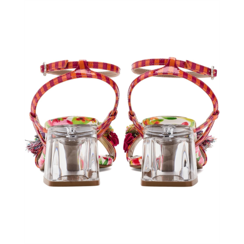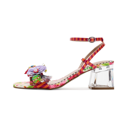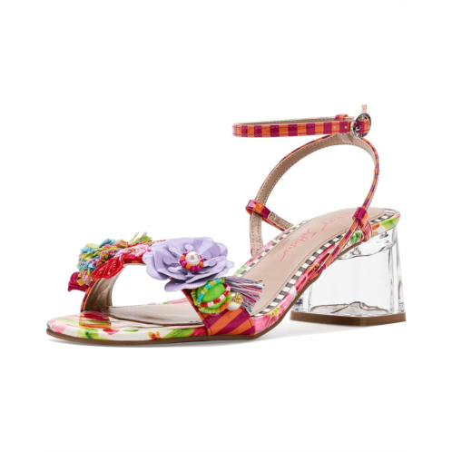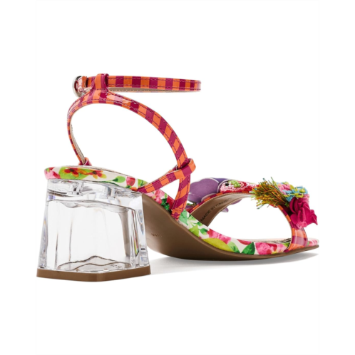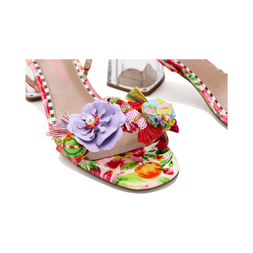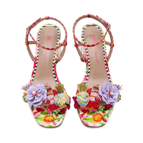 - The Blue by Betsey Johnson Merrily Sandals bring bold, whimsical charm to your look. Designed with a colorful strap upper, these sandals feature vibrant 3D floral and beaded embellishments accented with tassels and candy-inspired beads. A transparent block heel adds a modern touch, while the ankle strap with a buckle closure ensures a secure and adjustable fit.