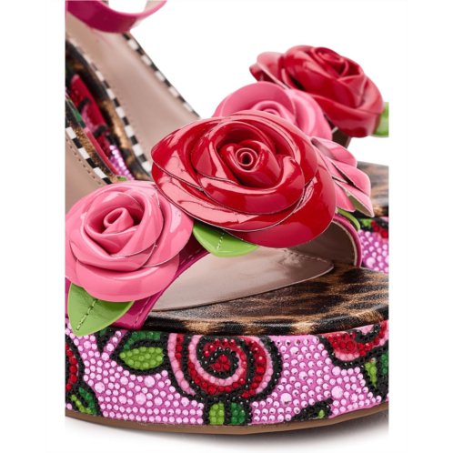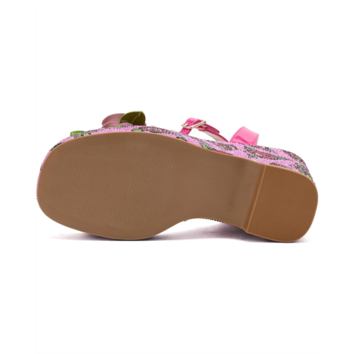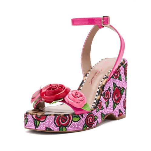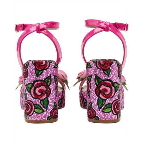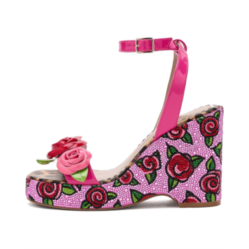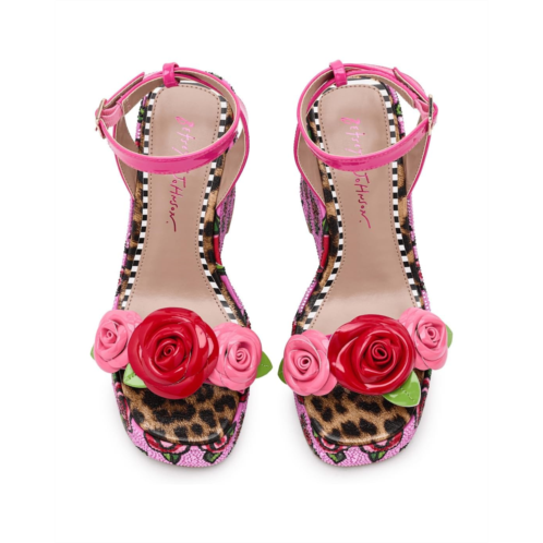 - The Blue by Betsey Johnson Lizzete sandal is a stylish sandal featuring an allover floral print with rhinestone embellishment and flower detail. These heeled sandals are made of a polyurethane (PU) upper, a nylon insole, and a nylon lining. Their ankle strap with an adjustable buckle closure offers a secure fit. Make your style statement with these printed slip-on sandals.